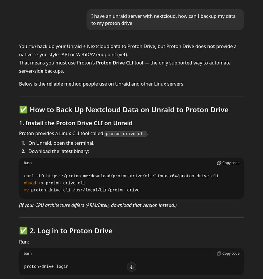 There isn't really much more to this. Just showing off the absolute absurdity that our economy is being ridden on the wave of this laughable excuse for a tool. I'm meant to fear being replaced by a tool that can't even google "Proton Drive Linux" and look at the first 3 results to see how wrong its answer was going to be.