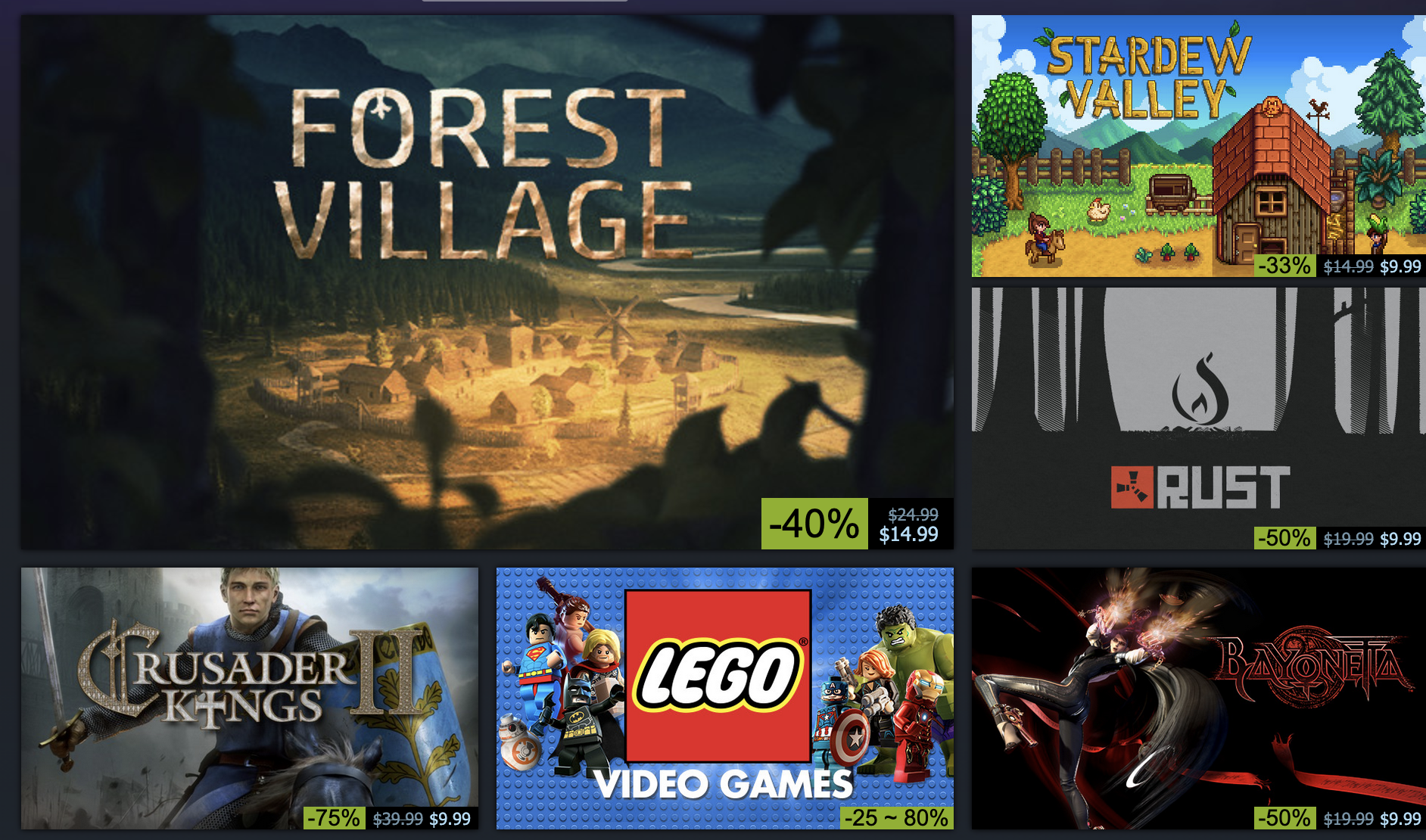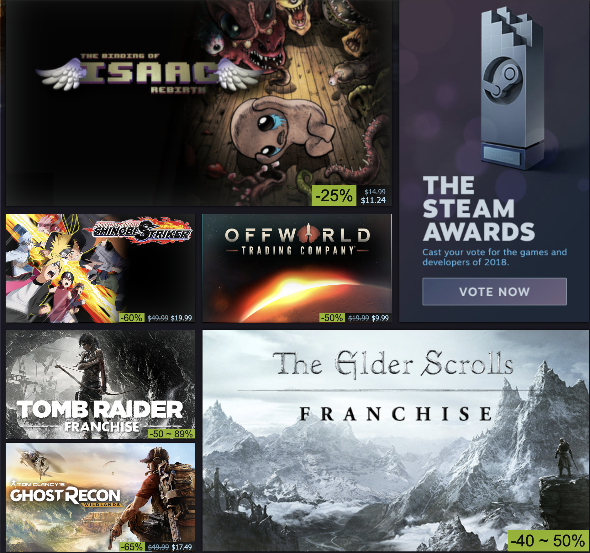 The Steam Layout changes as you can see after 2018 to go from this grid style to the three card layout. Safe to say it wasn't the design that made it worse, because all these discounts look pointless. Wildlands for $17, maybe? But the top deal being 25% off? ehhh