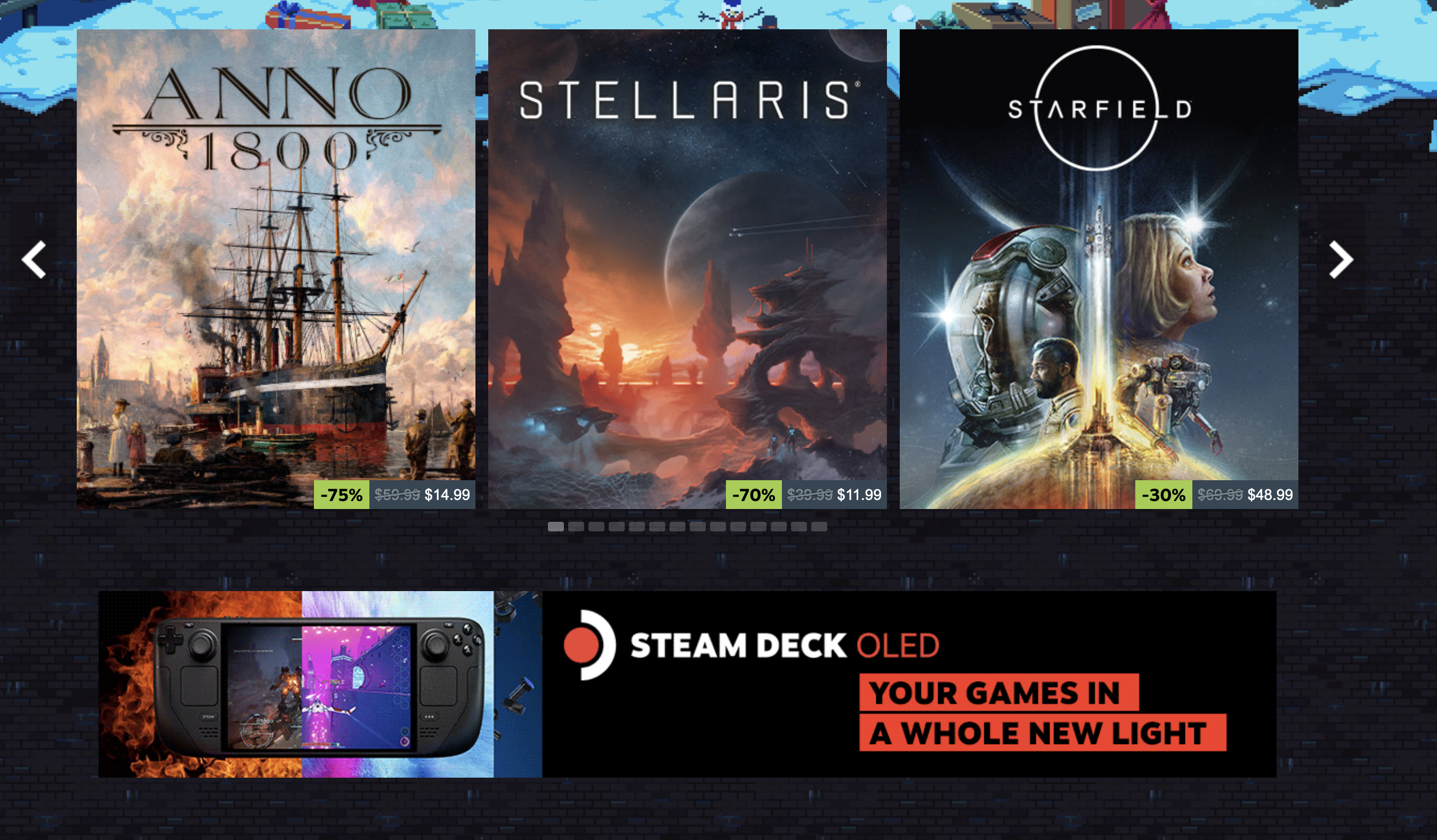 Here I don't think this is too bad, two decent games sitting at 75% off, front and center, with an AAA game sitting at 30%. I still think again that's too low but the perception to me is at least better weirdly here. Despite the Deep Discount section not being present. Guess Valve wanted to ship those OLED consoles.