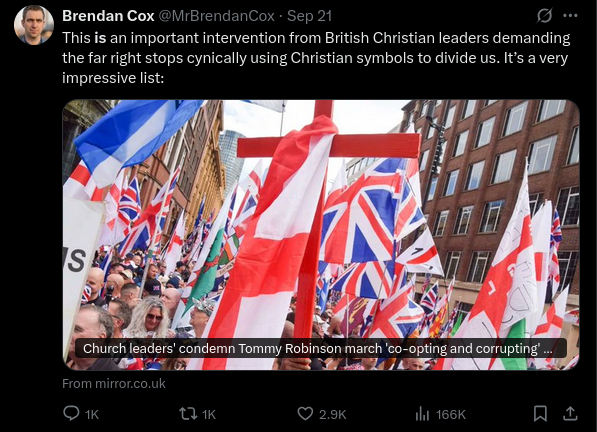 Now, this might be news to you, as someone that has seen the United States the past few months, and now the UK with our right wing groups going out with "Christ is King" posters. Fundamentally flying in the face of what this aimed to achieve.